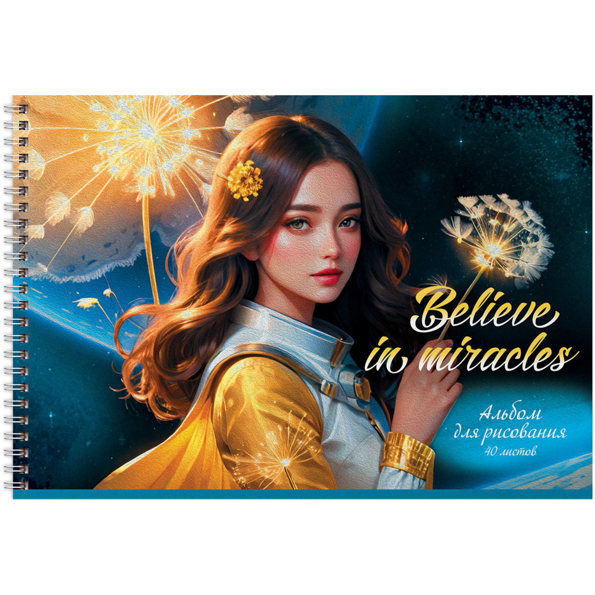 Альбом для рисования «Верь в чудеса» от бренда bg — удобный и практичный выбор для творчества. Альбом легко разместить на небольшом столе благодаря универсальному формату А4. Внутренний блок состоит из 40 листов офсетной бумаги плотностью 100 г/м². Прочная обложка из чистоцеллюлозного картона надежно защищает страницы от повреждений. Альбом удобно раскрывать на 360 градусов благодаря гребню. Для рисования можно использовать восковые мелки, цветные и черно-графитные карандаши, гелевые ручки и краски. Изделие можно взять с собой в школу или детский сад. Подойдёт школьникам, дошкольникам и людям, увлекающимся рисованием. Дизайн с девушками в волшебных образах оценят любители чудес. Надписи на обложках вдохновят на создание ярких шедевров.