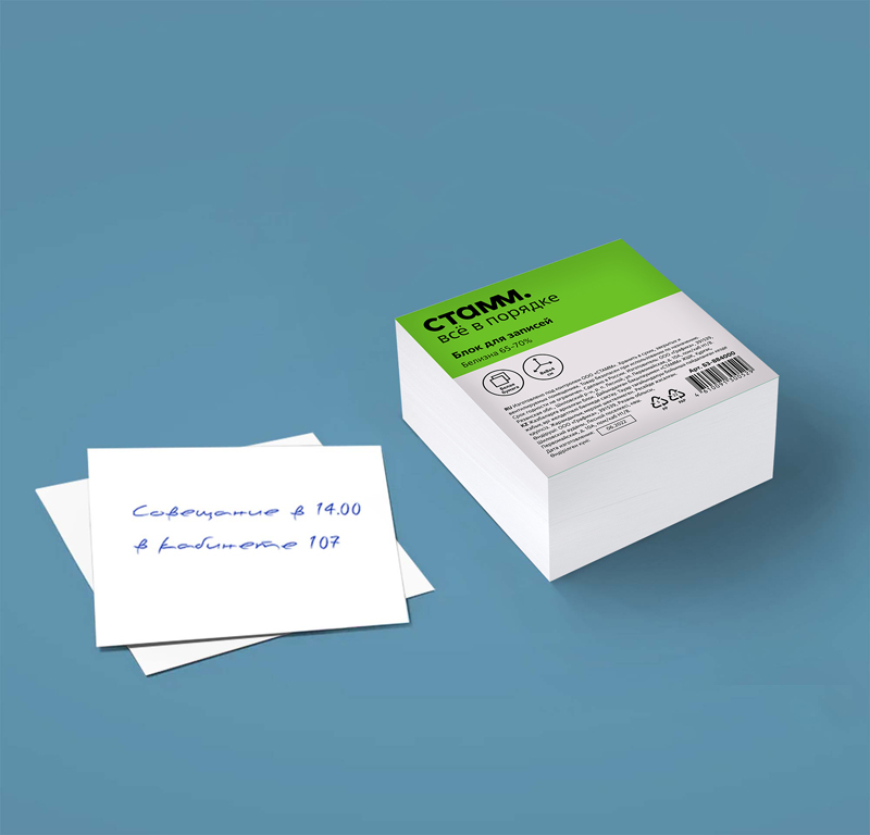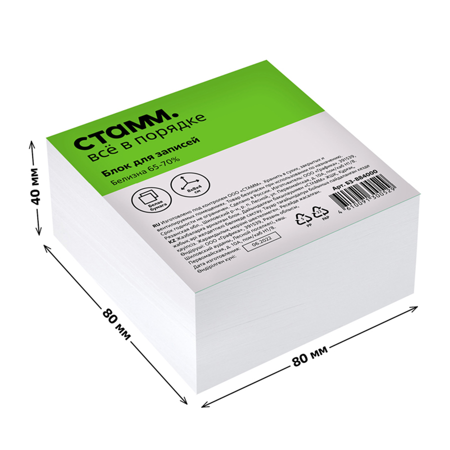Блок бумаги «СТАММ» подходит для оперативных записей необходимой информации. Размер листа в блоке: 80*80 мм, высота блока – 40 мм. Цвет бумаги блока - белый со стандартом белизны 65-70%. Может использоваться в пластиковых подставках и настольных органайзерах. Блок для записей представлен в индивидуальной упаковке в термоусадочной плёнке.