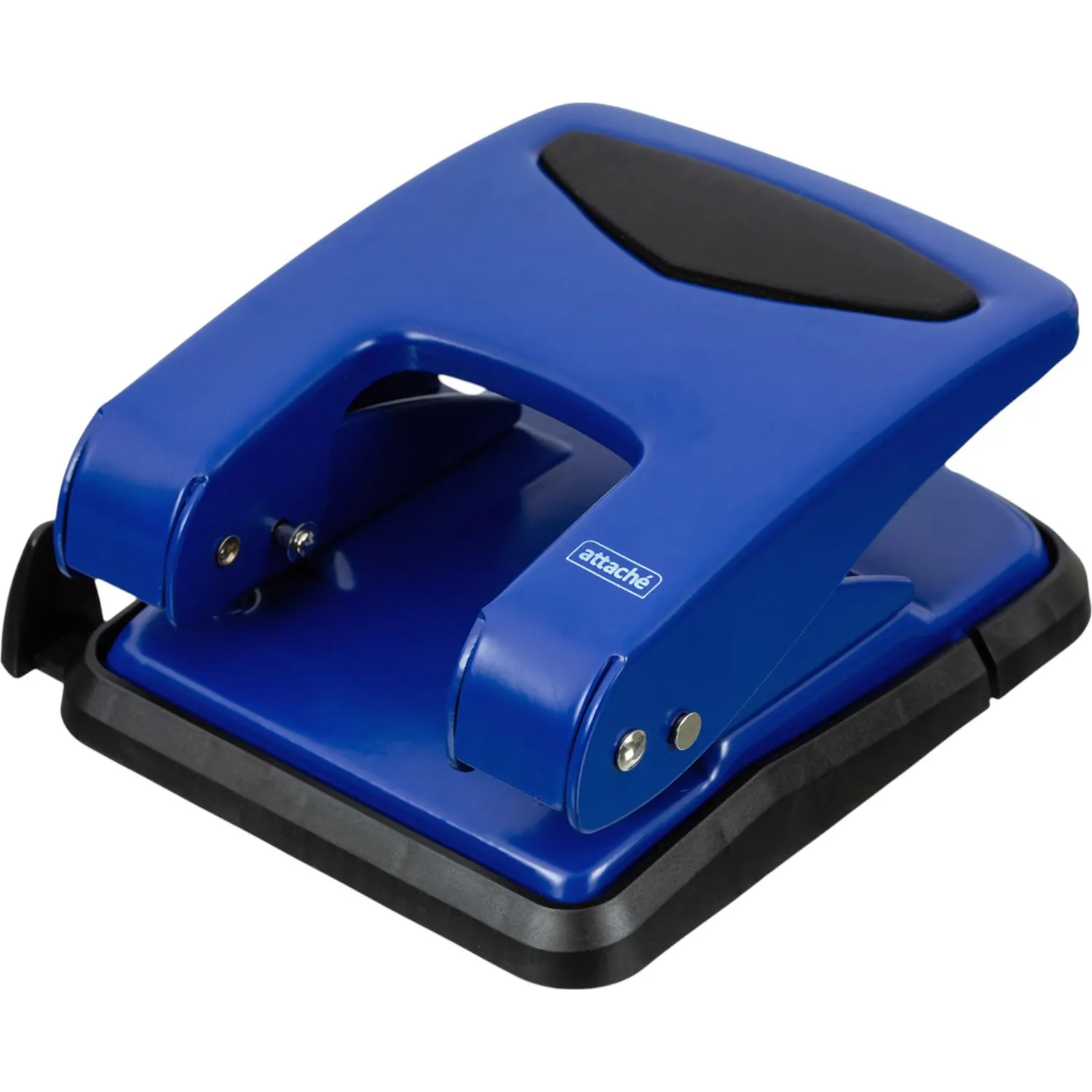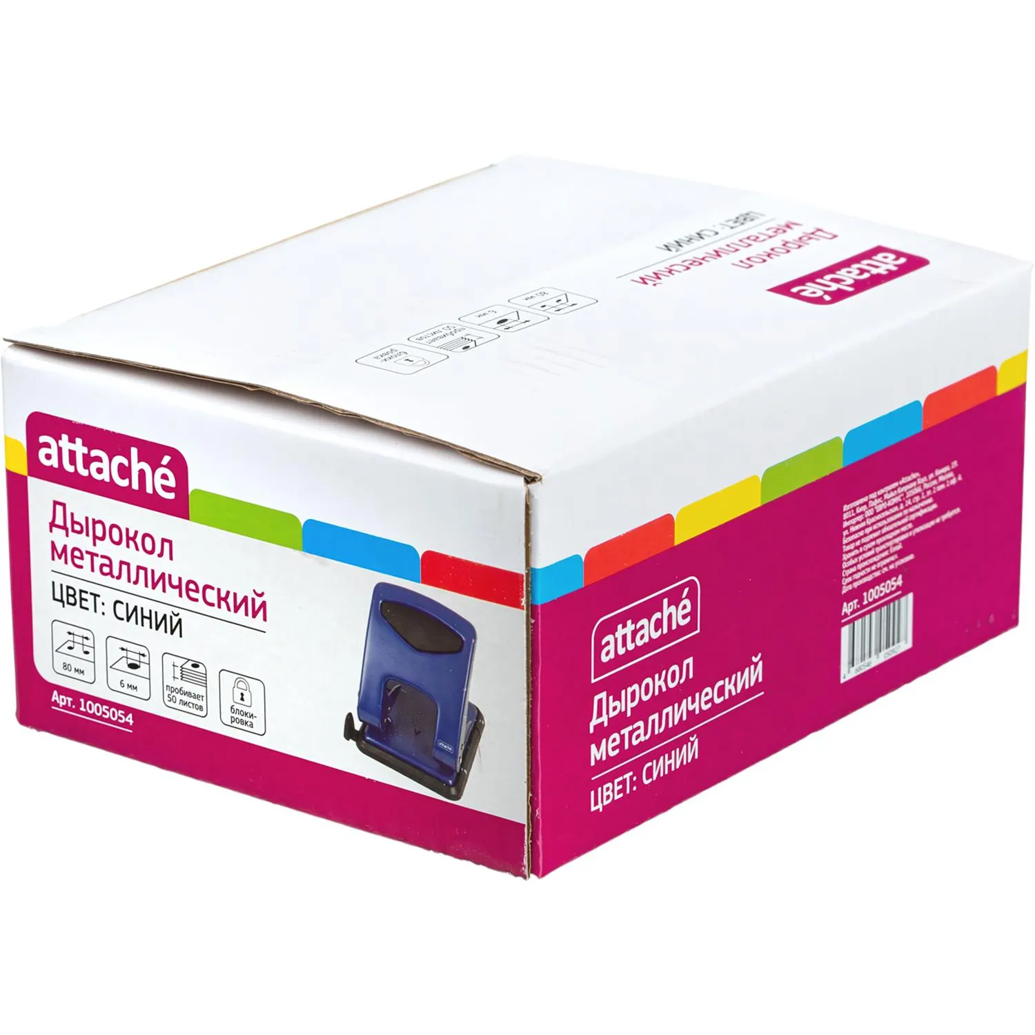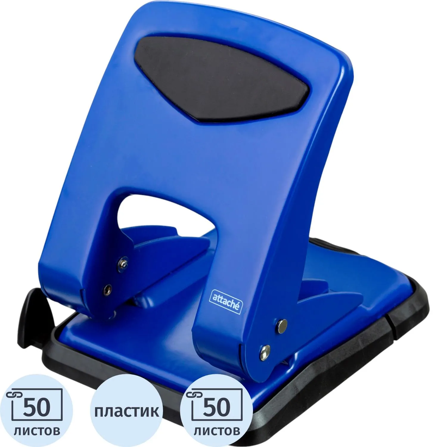 Дырокол Attache работает с документами толщиной до 50 листов плотностью 80 г/кв.м. Пробивает два отверстия диаметром 6 мм, расстояние между отверстиями — 80 мм. Размер дырокола: 14.5×11.5×14 см (со снятой блокировкой). Удобный контейнер легко открывается и закрывается, исключая рассыпание конфетти. Механизм металлический. Перед началом использования необходимо снять фиксацию дырокола в сложенном виде. Для этого нужно одновременно нажать на металлическую кнопку возле основания дырокола и верхнюю часть дырокола. Точно также можно зафиксировать дырокол обратно в закрытое положение для экономии рабочего пространства и удобной перевозки. Наличие линейки A3, A4, A5, A6, B4, B5, B6 позволяет зафиксировать бумагу на нужном расстоянии, отметка на линейке 888 позволяет использовать вместо дырокола на 4 отверстия. Дырокол выполнен в металлическом синем корпусе с противоскользящей прорезиненной вставкой черного цвета. Имеет метку центрирования.
