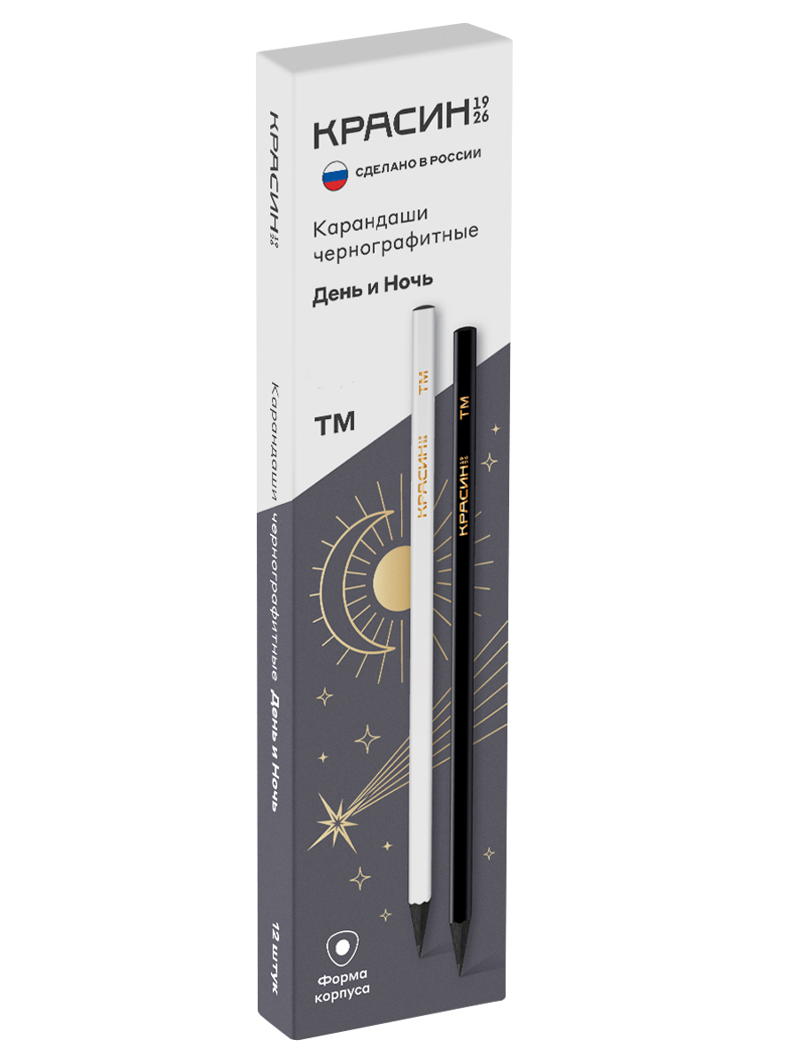 Карандаши чернографитные «Красин» из серии «День и Ночь» выполнены из чёрного дерева и представлены в двух стильных лаконичных цветах корпуса - в матовом чёрном и матовом белом цвете. Они отлично подходят как для офиса, так и для школы. Корпус карандашей выполнен из древесины липы высокого качества. Карандаши легко и ровно затачиваются, устойчивы к повреждениям и поломкам. Качественный состав грифеля обеспечивает мягкое письмо, чёткую и однородную линию на бумаге, которая легко стирается при помощи ластика.