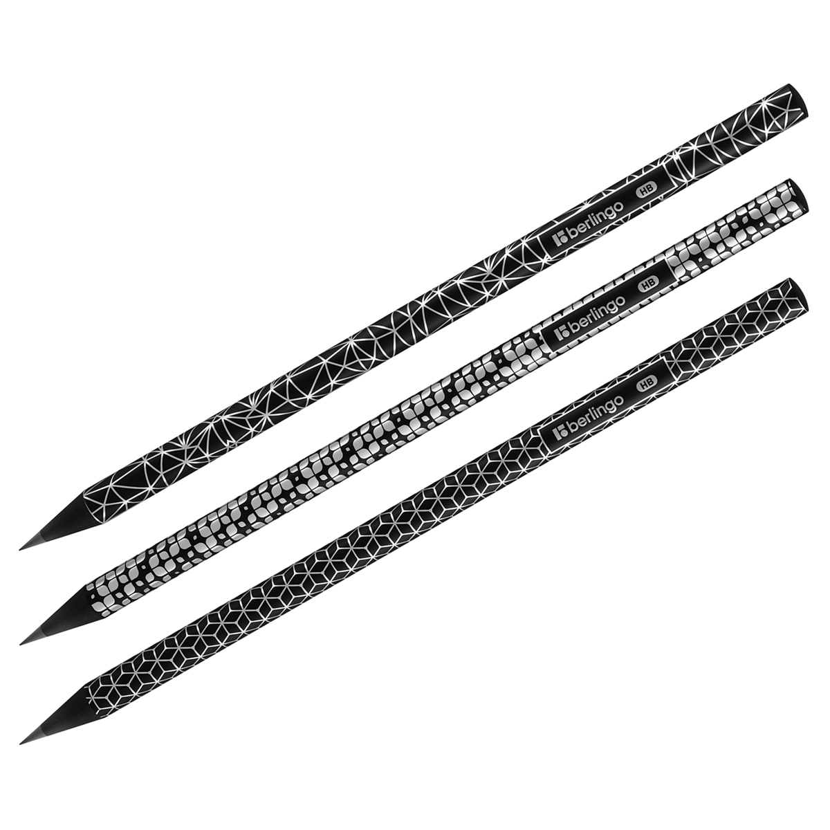 Чернографитный ударопрочный карандаш Berlingo "Doubleblack" из черного дерева, с заточкой. Глянцевое покрытие корпуса серебряной фольгой, дизайны ассорти. Не ломается при падении. Подходит для черчения и рисования. Диаметр грифеля 2,2 мм, твердость HB, круглая форма, штрих-код на корпусе.