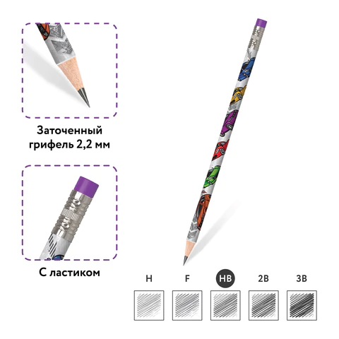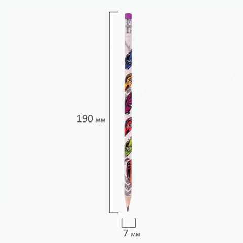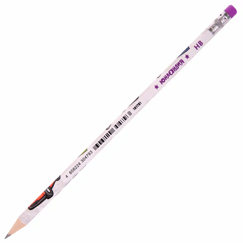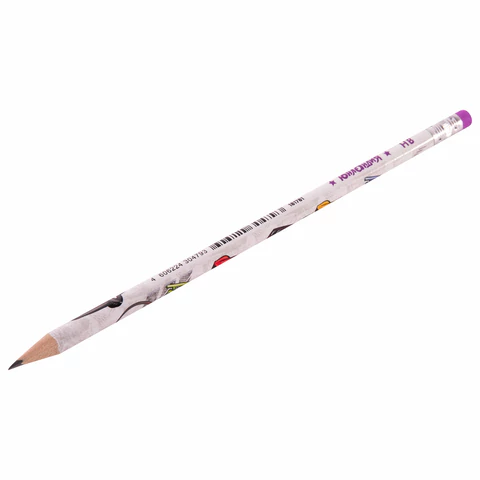 Каждый карандаш имеет индивидуальный штрих-код. Легко затачивается, максимально устойчив к повреждениям. Изготовлен из дерева высокого качества. Имеет круглый корпус с яркой печатью, оснащен ластиком. Карандаш длиной 190 мм обладает средней степенью твердости – HB.