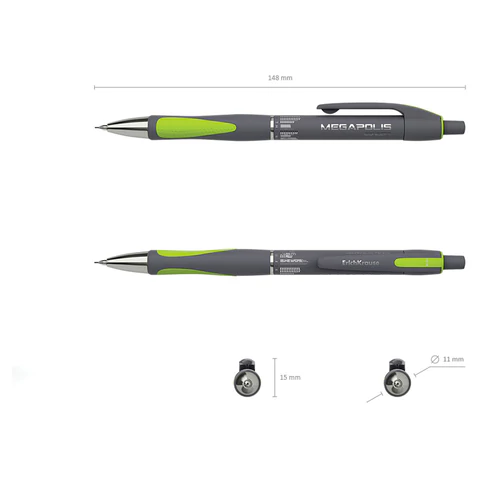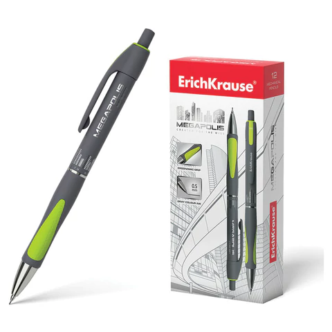 Механический карандаш с металлическим наконечником и убирающейся цангой. Карандаш имеет круглый глянцевый корпус с эргономичной грип-зоной, оснащенной двумя резиновыми неоновыми вставками. Твердость HB. Диаметр грифеля — 0.5 мм. Модель Megapolis Concept имеет узнаваемую запатентованную форму, обладает великолепной эргономикой и стала одним из бестселлеров среди механических карандашей Erich Krause более чем в пятидесяти странах мира.