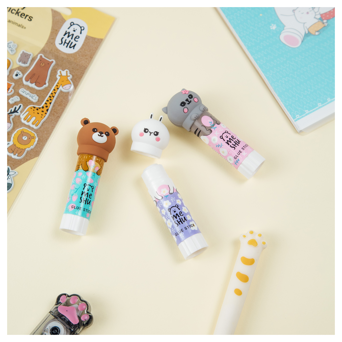 Клей-карандаш ПВП MESHU с топером Animals – универсальный помощник для работы в офисе, школы и детского творчества. Вес – 8 граммов. Формула на основе ПВП позволяет склеивать бумагу, картон, фотографии. Клей-карандаш белого цвета нетоксичен и легко смывается водой, морозоустойчив. При работе быстро высыхает и не имеет неприятного запаха. Круглый корпус украшают милые топперы в виде животных.