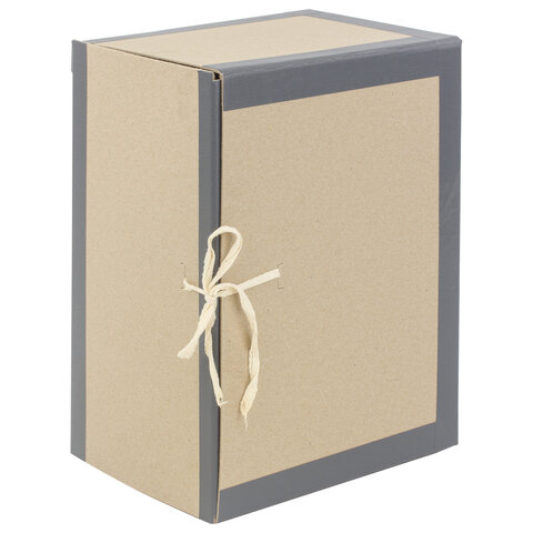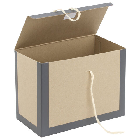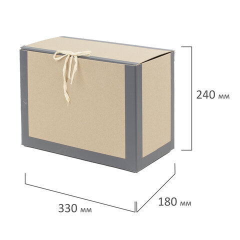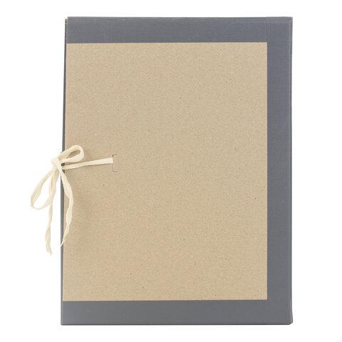 Изготовлен из переплетного картона толщиной 1,75 мм с покрытием из бумвинила. Имеет поля для записей на лицевой стороне. Вмещает до 1700 листов. Выдерживает до 15 кг. Размер короба - 33x18x24 см. Имеет откидную крышку и 2 хлопчатобумажные завязки. Поставляется в разобранном виде.