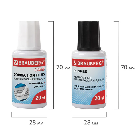 Корректирующий набор BRAUBERG включается в себя корректирующую жидкость и разбавитель для корректуры. Объем - 20 + 20 мл.