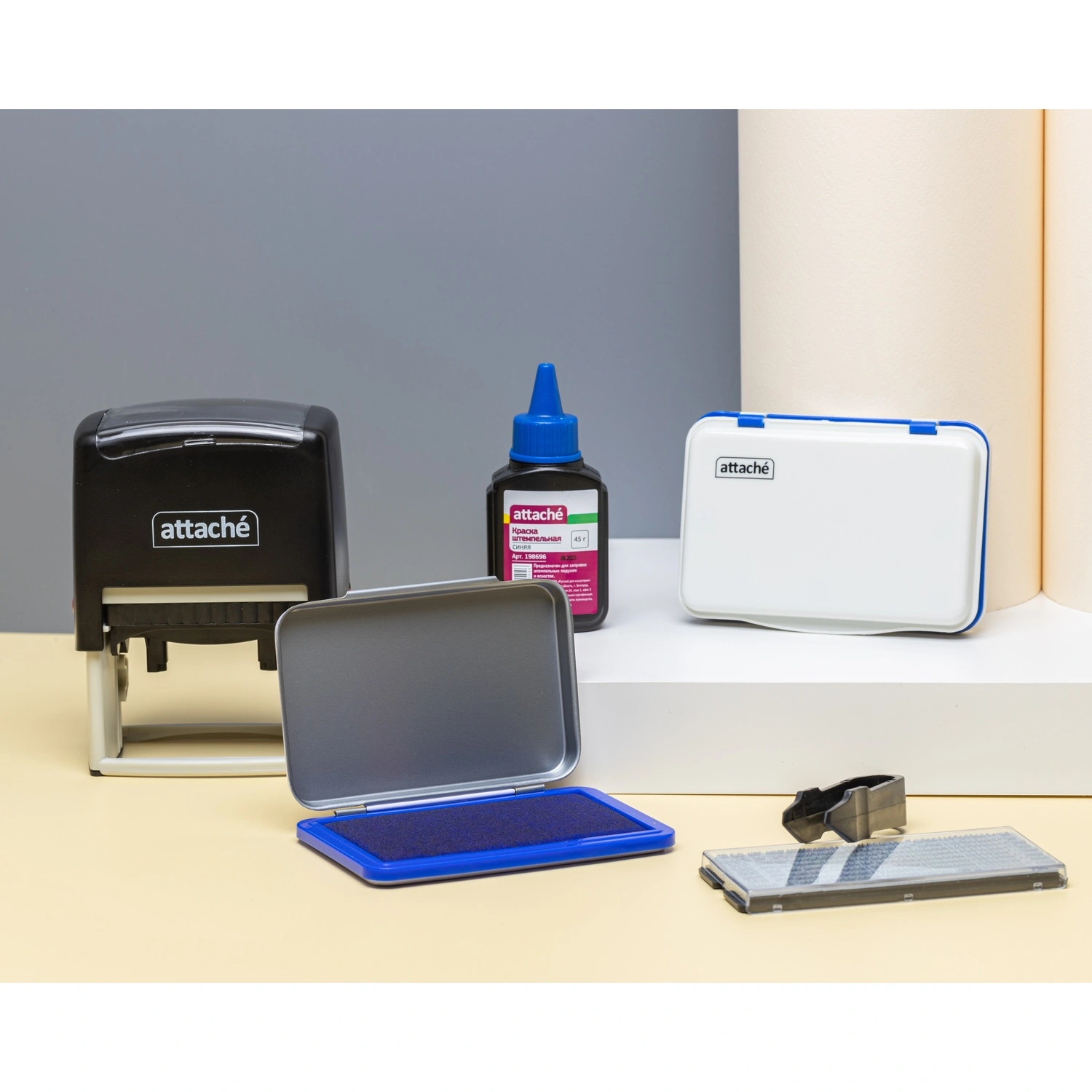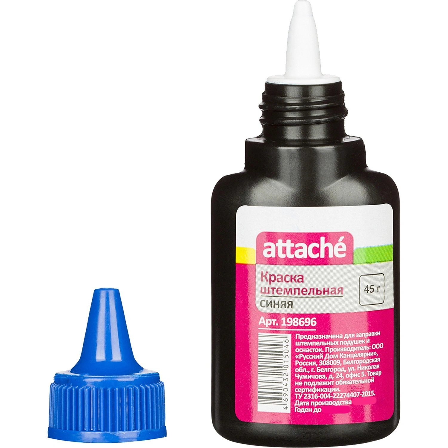 Краска штемпельная Attache синяя на водно-глицириновой основе. Объём флакона 45 г. Флакон снабжён дозатором, обеспечивающим равномерное нанесение краски на подушку. Предназначена для заправки штемпельных подушек и оснасток. Назначение: для бумаги. Время высыхания оттиска 90 секунд.
