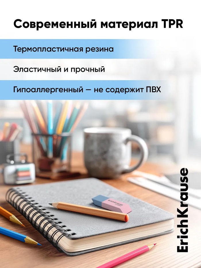 Двусторонний ластик с разной степенью жесткости из экологически чистого и гипоаллергенного материала термопластичной резины (TPR) с пониженным образованием крошек (Dust free). Синяя сторона ластика средней жесткости предназначена для стирания линий от графитового карандаша, розовая жесткая сторона с абразивными свойствами - для стирания чернил шариковых ручек. Размер 54ммх18ммх7,5мм. Не содержит ПВХ.