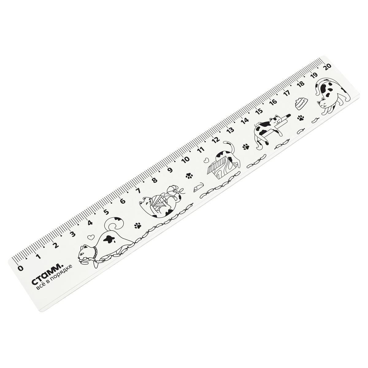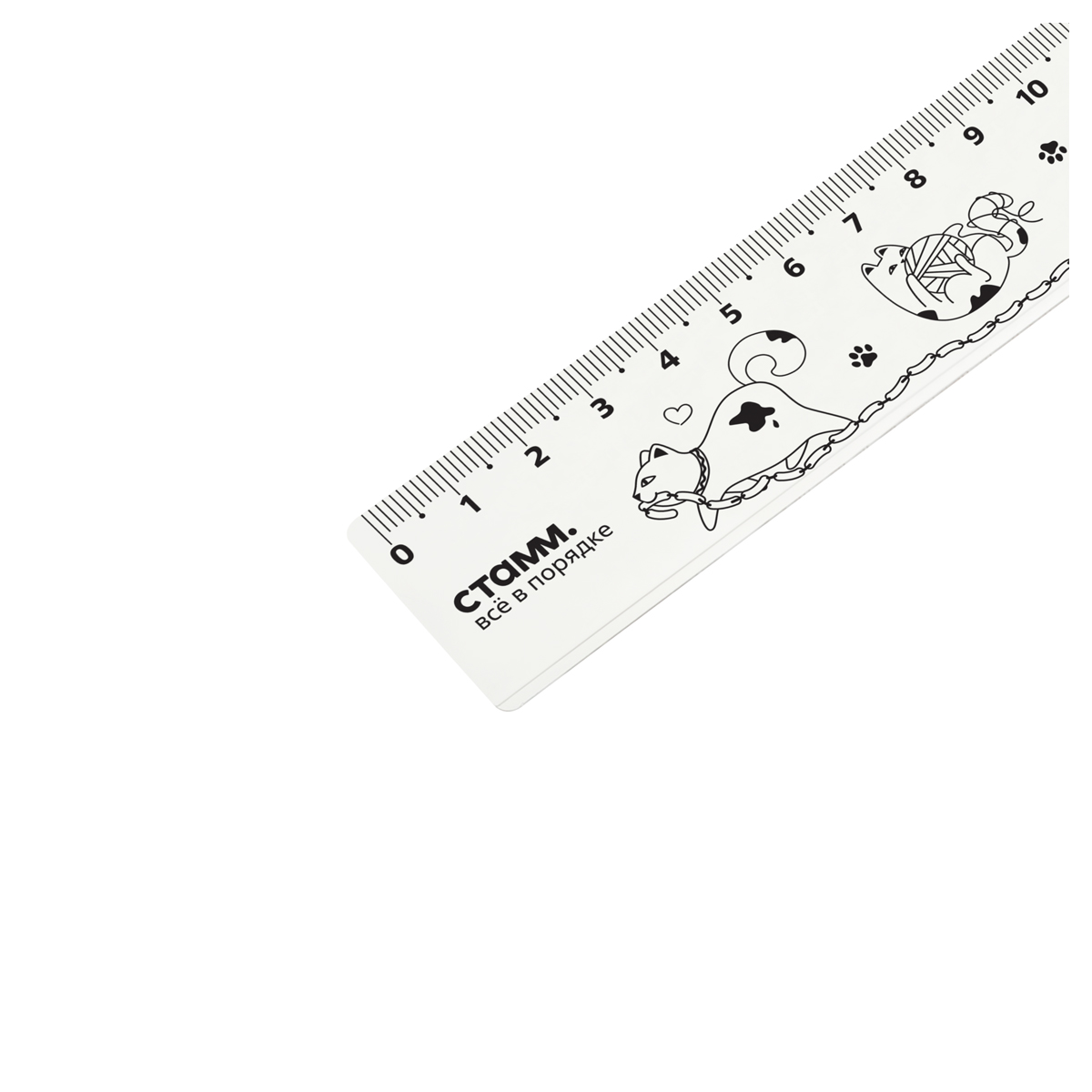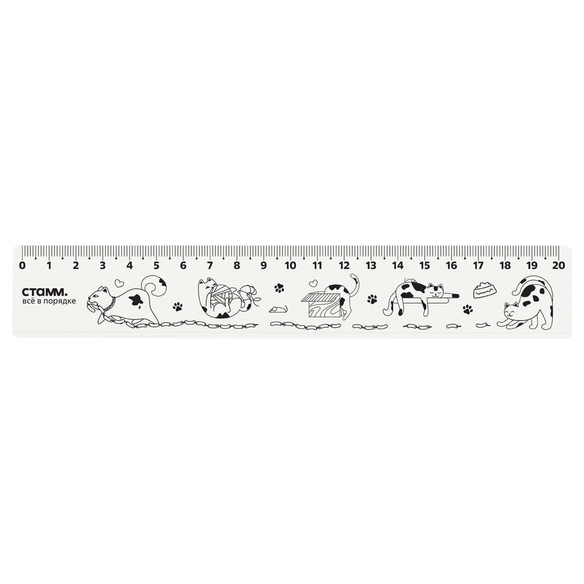 Линейка СТАММ "Коты" предназначена для чертёжно-измерительных работ. Длина шкалы – 20 см, ширина линейки – 35 мм. Изделие имеет безопасные закруглённые края и чёткую контрастную миллиметровую шкалу. Линейка изготовлена из качественного полистирола, и имеет гладкую глянцевую поверхность. Линейка дополнена оригинальным дизайном. Цвет изделия – прозрачный.