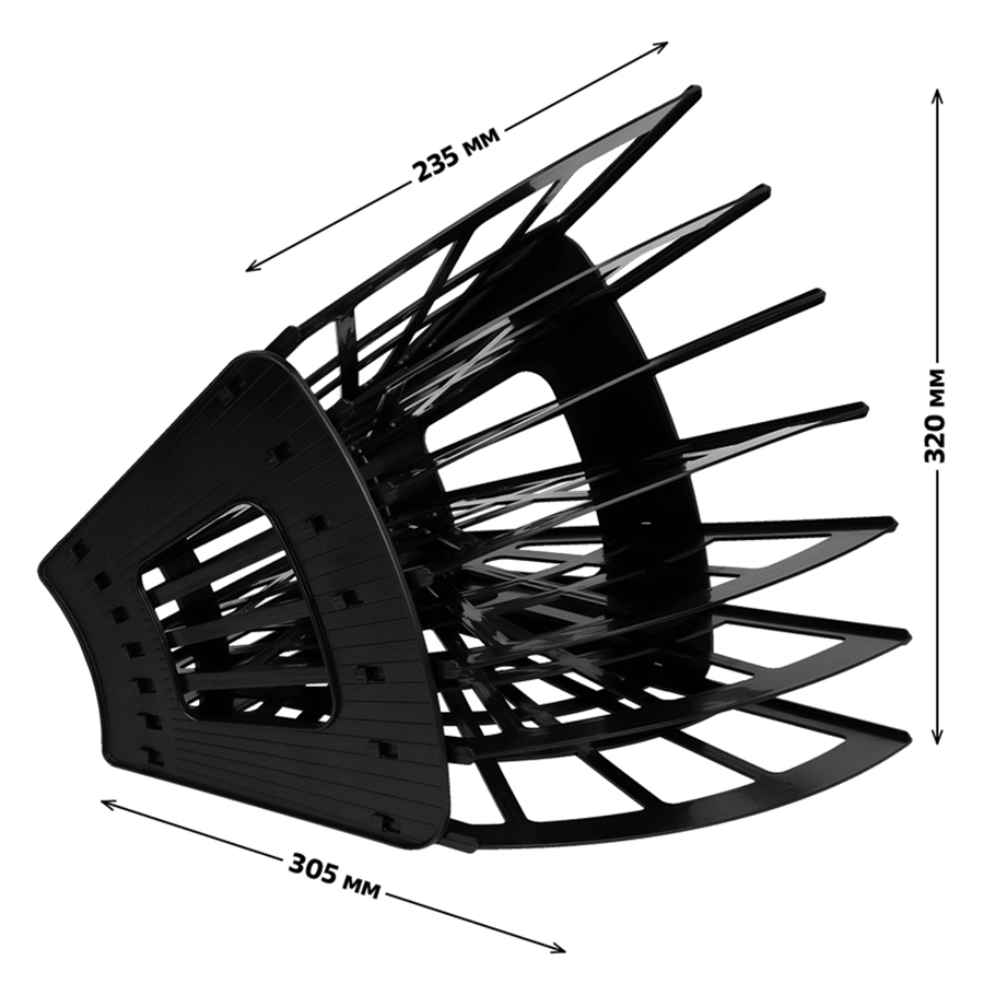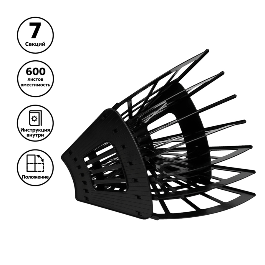 Лоток СТАММ серии "Эконом" 7-ми секционный 6 отделений для бумаг формата А4 предназначен для хранения и систематизации бумажной продукции. Конструкция предусматривает возможность горизонтального и вертикального расположения. Регулируемая ширина отделений. Прочный, легкий, вместительный корпус. Изготовлен из качественного пластика. Упакован в термоусадочную пленку, поставляется в разобранном виде. Цвет лотка - черный. Изделие высотой 305мм, шириной 320мм, глубиной 235мм вмещает до 600 листов.
