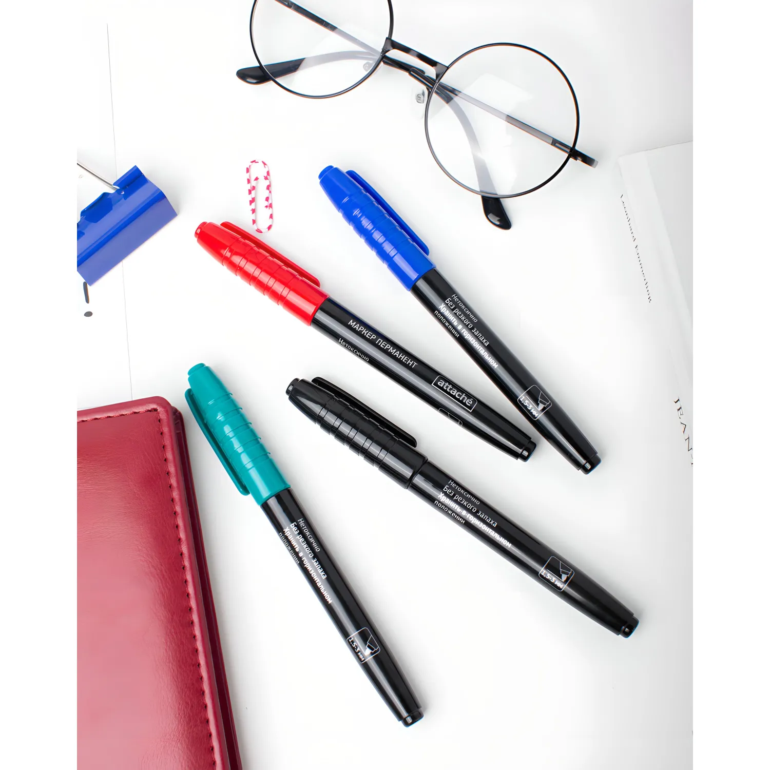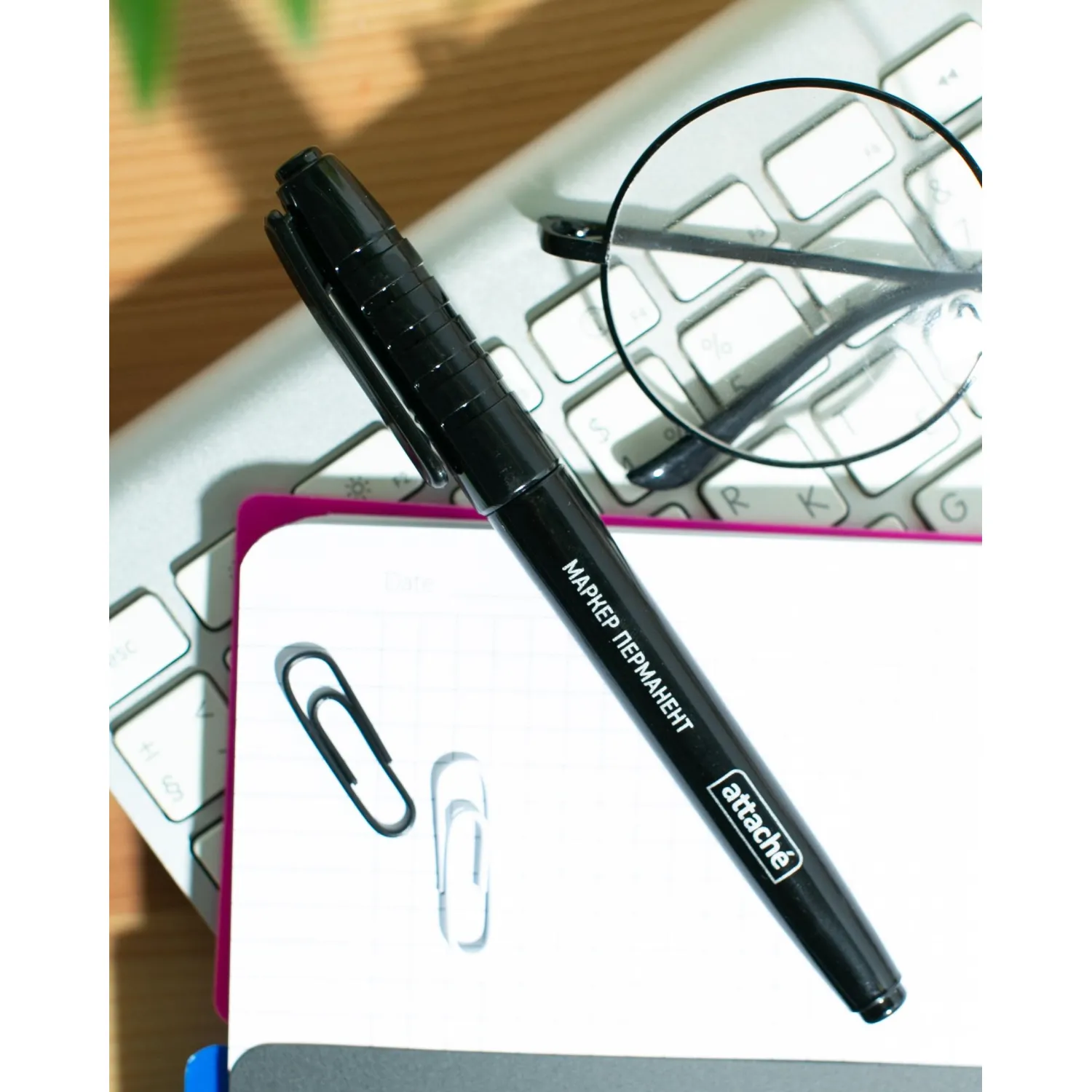 Особая нестираемая основа перманентного маркера Attache черного цвета обеспечивает такие качества, как стойкость к воздействию воды, ультрафиолета, низких и высоких температур. Можно маркировать, среди прочего, пластмассовые, деревянные, металлические, стеклянные или картонные предметы. Цвет колпачка соответствует цвету чернил. Фетровый, круглый, эластичный наконечник обладает повышенной износостойкостью и обеспечивает экономный расход чернил. Отличается продленной линией письма. Изделие не перезаправляется. Плотно закрывается колпачком, что предотвращает высыхание наконечника и чернил. Толщина линии письма — 1,5-3 мм в зависимости от угла наклона. Спиртовая основа быстросохнущих чернил. Круглая форма корпуса из пластика, колпачок снабжен клипом. Перманентный маркер Attache должен быть всегда под рукой!