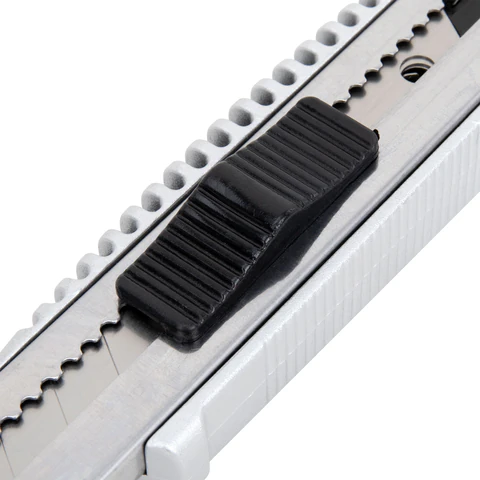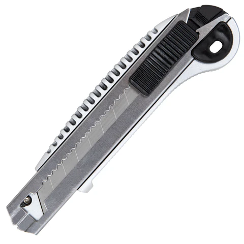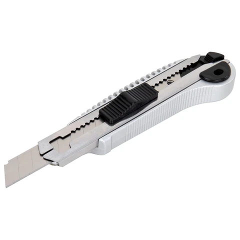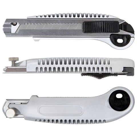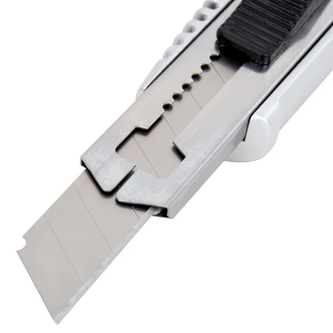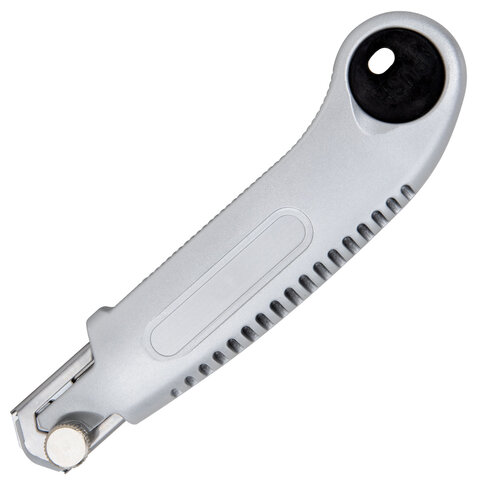 Благодаря своей обтекаемой форме нож удобно держать в руке. Пластиковый корпус гарантирует безопасность применения. Автофиксатор позволяет закрепить лезвие в нужном положении с помощью защелки. Для того, чтобы хранить и переносить инструмент было проще, в корпусе имеется небольшое отверстие. Нож усилен металлическими направляющими, которые надежно удерживают лезвие шириной 18 мм и позволяют выдерживать большую нагрузку.