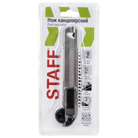 Канцелярский нож STAFF – универсальный, удобный и простой инструмент, который применяется во многих сферах: на складе, в офисе, строительстве, производстве, творчестве и дома. Предназначен для резки различных материалов разной плотности и толщины.