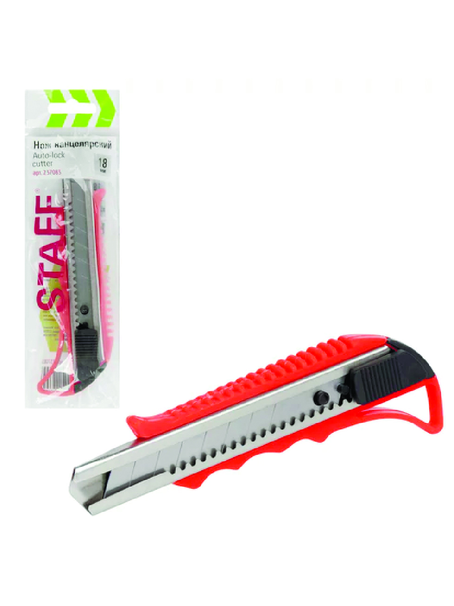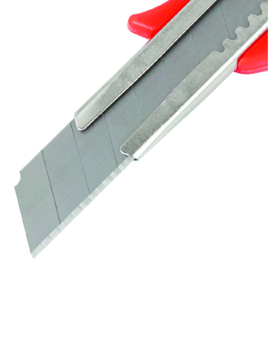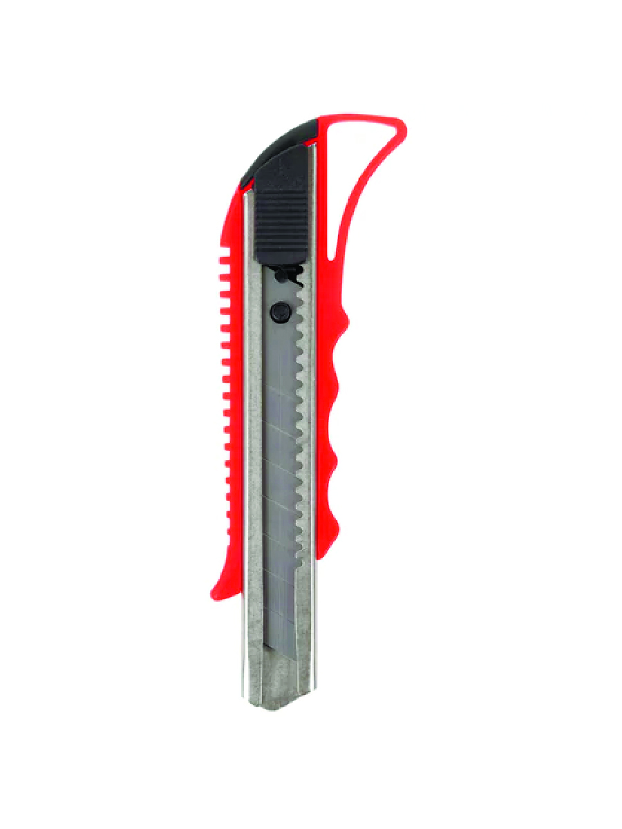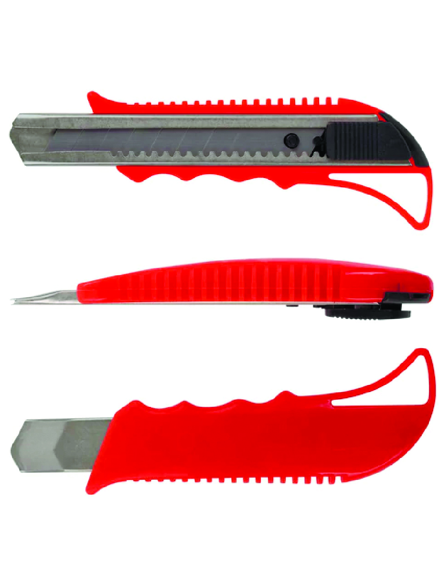 Благодаря своей обтекаемой форме нож удобно держать в руке. Пластиковый корпус гарантирует безопасность применения. Автофиксатор позволяет закрепить лезвие в нужном положении с помощью защелки. Для того, чтобы хранить и переносить инструмент было проще, в корпусе имеется небольшое отверстие. Нож усиленный с металлическими направляющими, которые надежно удерживают лезвие шириной 18 мм и позволяют выдерживать большую нагрузку.