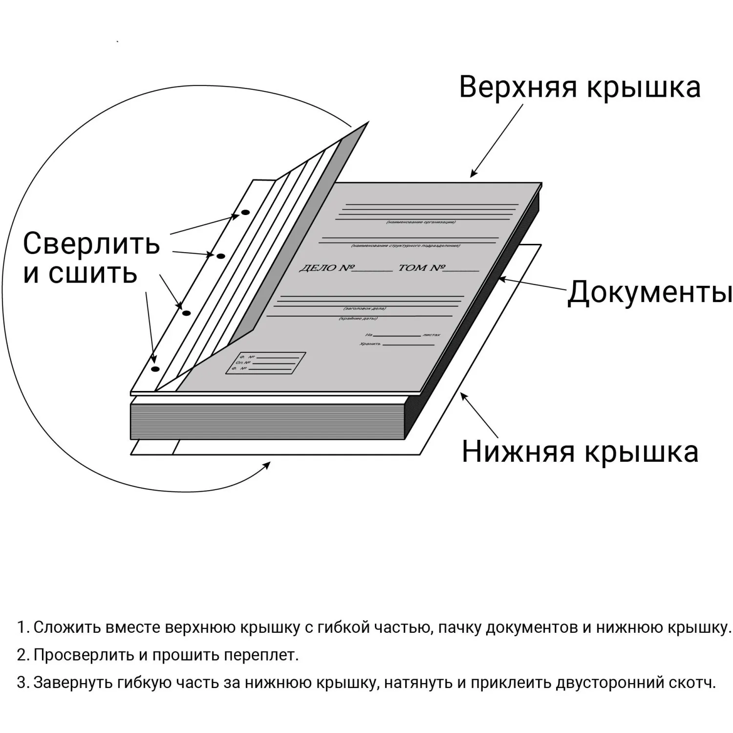 Папка для переплета изготовлена из переплетного картона бежевого цвета. Предназначена для сшивания документов. Максимальная толщина дела составляет 40 мм (около 350 листов стандартной плотности).
