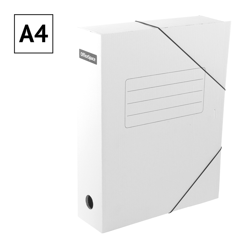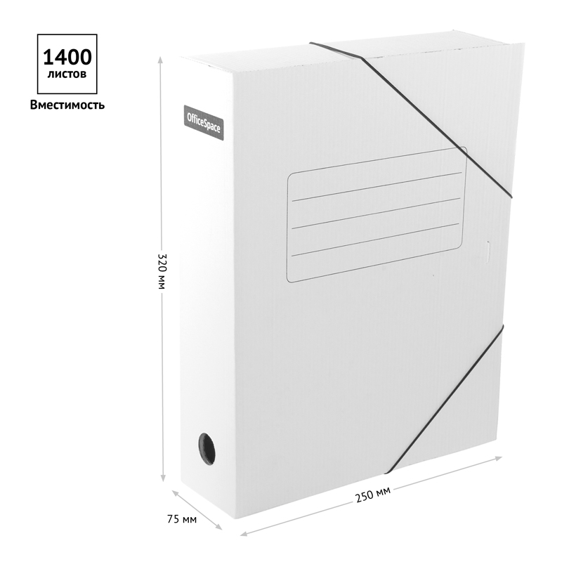 Папка архивная на резинках OfficeSpace формата А4 идеально подойдёт для хранения документов. Товар изготовлен из микрогофрокартона белого цвета. Папка обеспечивает максимальный доступ к документам при раскрытии. Прочная конструкция и стандартизованный размер позволяют хранить документы вертикально и горизонтально на стеллажах или в архивных коробах. На лицевой и боковых гранях имеются поля для маркировки. Размер папки: 320*250 мм, ширина корешка: 75 мм, вместимость 700 листов.