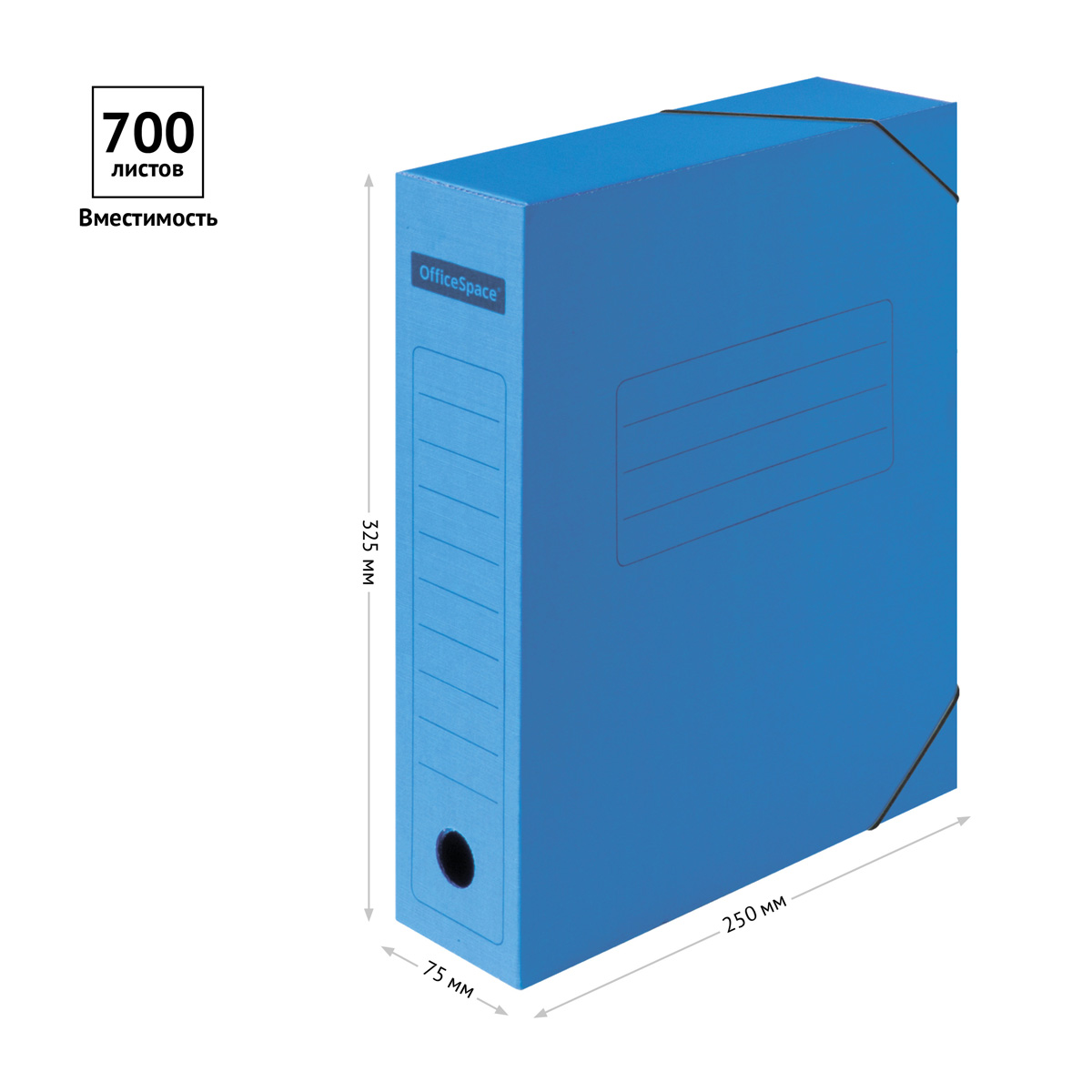 Папка архивная на резинках OfficeSpace формата А4 идеально подойдёт для хранения документов. Товар изготовлен из микрогофрокартона синего цвета. Папка обеспечивает максимальный доступ к документам при раскрытии. Прочная конструкция и стандартизованный размер позволяют хранить документы вертикально и горизонтально на стеллажах или в архивных коробах. На лицевой и боковых гранях имеются поля для маркировки. Размер папки: 320*250 мм, ширина корешка: 75 мм, вместимость 700 листов.