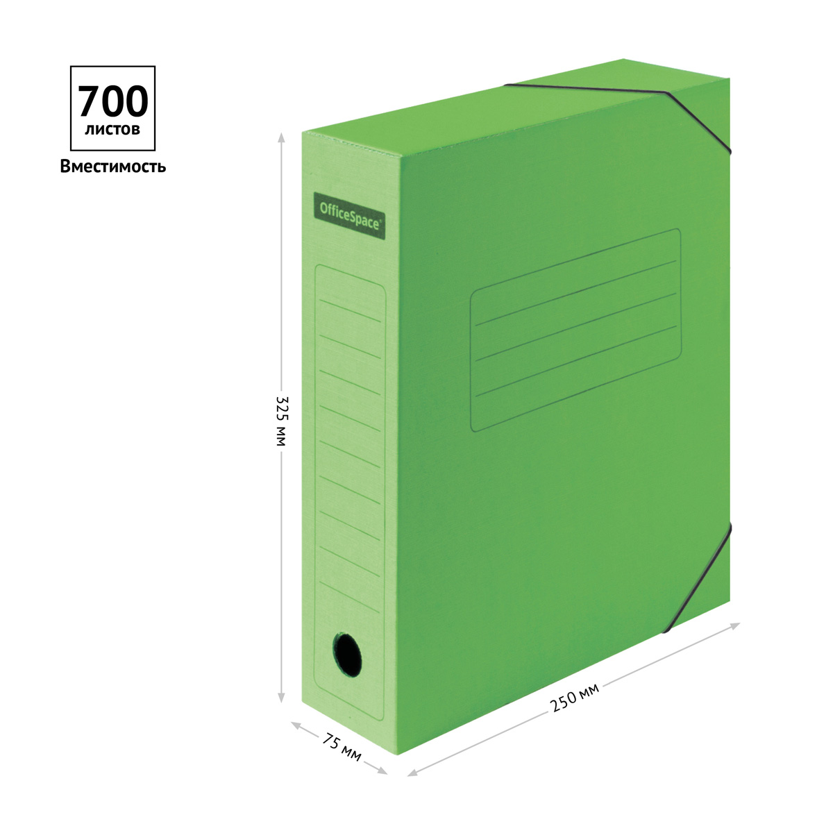 Папка архивная на резинках OfficeSpace формата А4 идеально подойдёт для хранения документов. Товар изготовлен из микрогофрокартона зеленого цвета. Папка обеспечивает максимальный доступ к документам при раскрытии. Прочная конструкция и стандартизованный размер позволяют хранить документы вертикально и горизонтально на стеллажах или в архивных коробах. На лицевой и боковых гранях имеются поля для маркировки. Размер папки: 320*250 мм, ширина корешка: 75 мм, вместимость 700 листов.