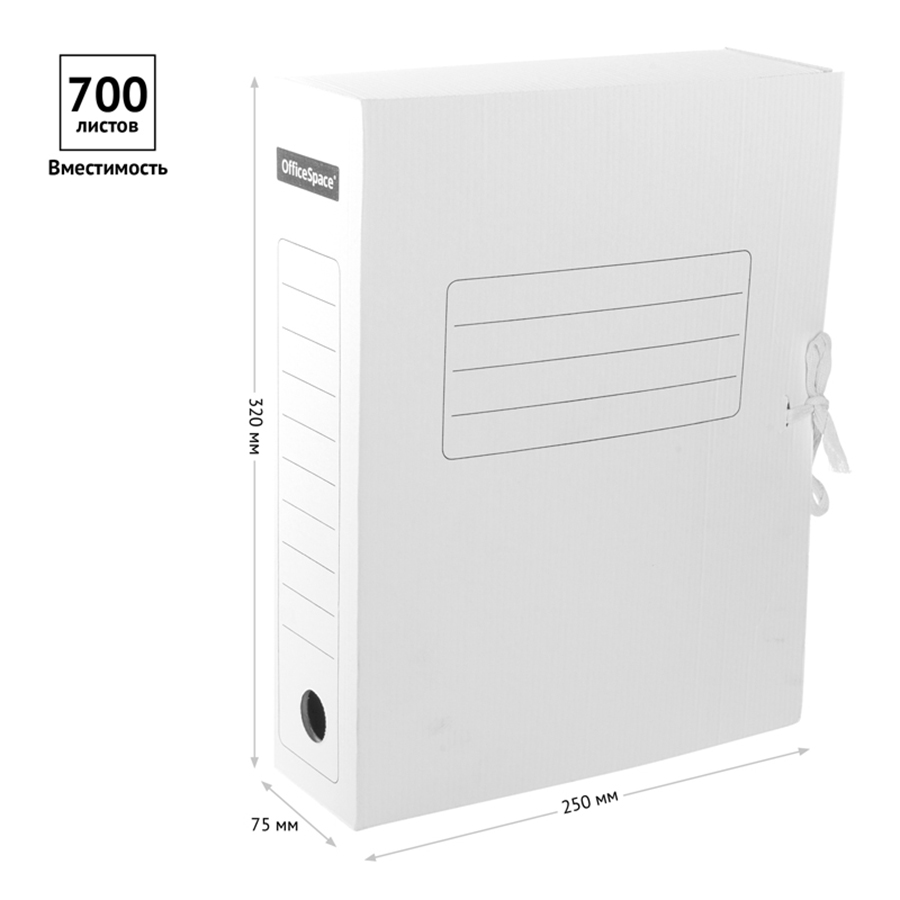 Папка архивная на завязках OfficeSpace формата А4 идеально подойдёт для хранения большого объёма документации. Товар изготовлен из микрогофрокартона белого цвета. Наличие 2-х завязок обеспечивает дополнительную прочность. Она обеспечивает максимальный доступ к документам при раскрытии. Прочная конструкция и стандартизованный размер позволяют хранить документы вертикально и горизонтально на стеллажах или в архивных коробах. На лицевой и боковых гранях имеются поля для маркировки. Размер папки: 250*75*325 мм, ширина корешка: 75 мм. Вместительность: 700 л.