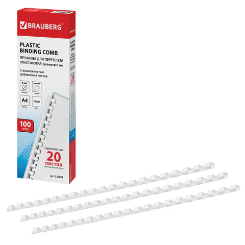 Рекомендуется использовать для переплета документов объемом от 10 до 20 листов. Изготовлена из высококачественного пластика белого цвета. Состоит из 21 кольца диаметром 6 мм. В упаковке 100 штук.