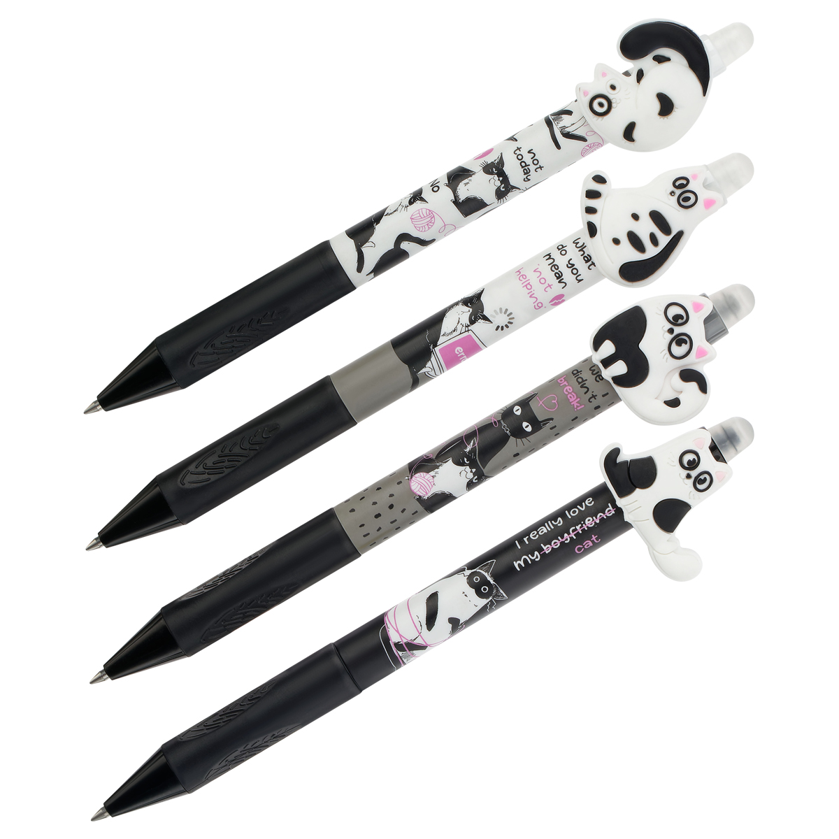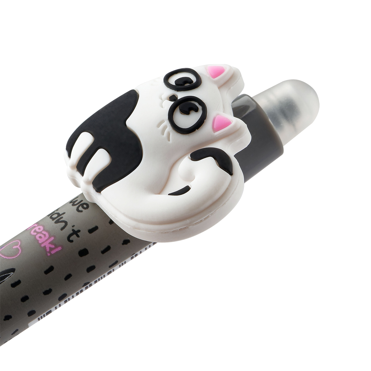 Гелевая стираемая автоматическая ручка MESHU Funny cats станет ярким атрибутом отличного настроения на работе или учёбе. Изделие обладает необычным дизайном с топпером-игрушкой. У ручки кнопочный механизм подачи стержня. Гелевые чернила не только ярко пишут на бумаге, но и при воздействии температуры становятся невидимыми – достаточно потереть написанное специальным ластиком на кончике ручки. Обесцвеченные чернила проявляются при низкой температуре. Диаметр пишущего узла составляет 0,5 мм, благодаря чему ручка прекрасно подойдёт для любого стиля письма. Толщина линии составляет 0,3 мм. Благодаря чернилам синего цвета ручку ежедневно можно использовать в работе или учёбе.