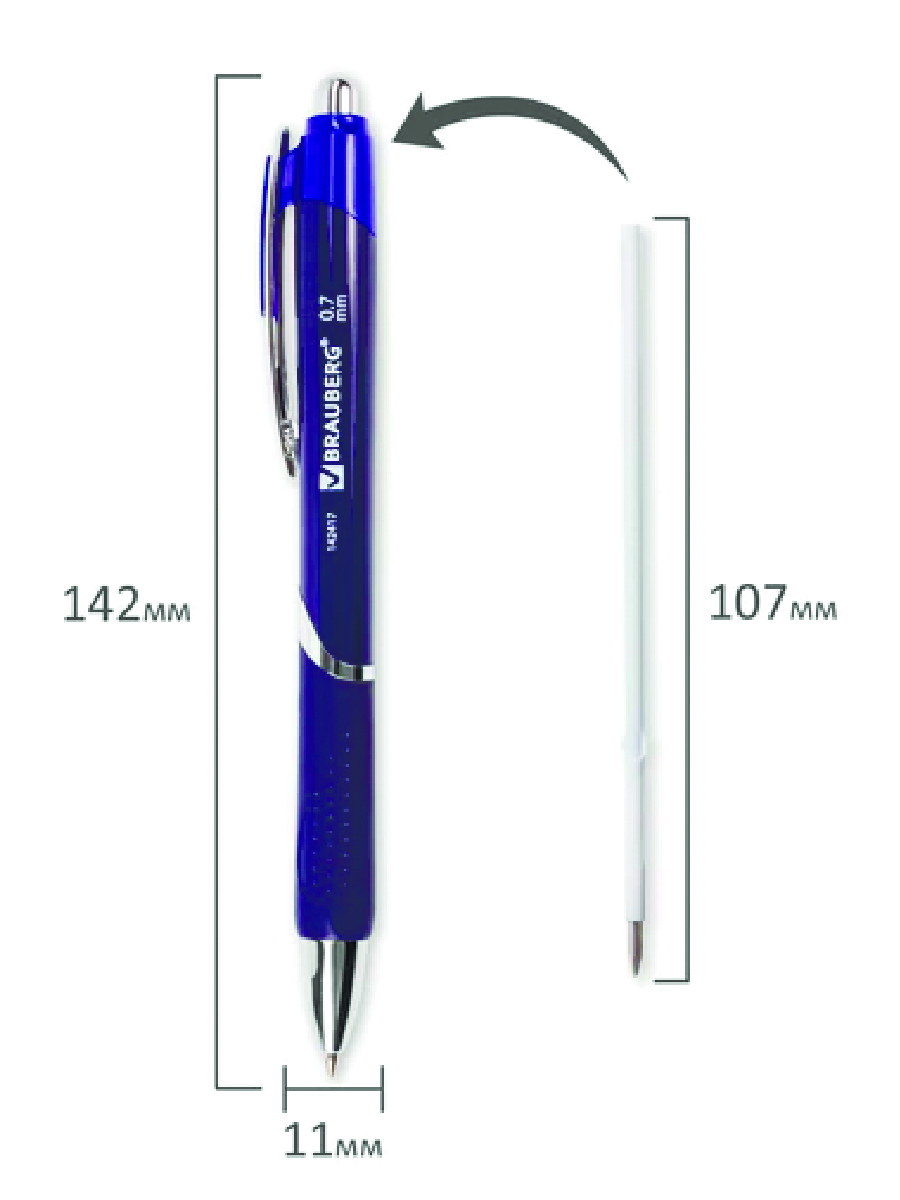 Модель изготовлена из высококачественных материалов, сменный стержень длиной 107 мм заправлен чернилами синего цвета. Удобный резиновый грип в зоне захвата, препятствующий скольжению пальцев при письме. Диаметр пишущего узла 0,7 мм создает тонкую линию письма, равную 0,35 мм. Стильный корпус с печатью соответствует офисному стилю.