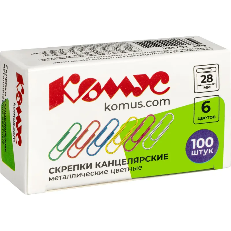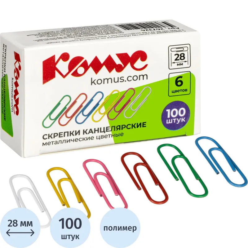 Скрепки Комус незаменимы при работе в офисе или дома, когда нужно соединить несколько бумаг, например, все листы договора или другие важные документы. Скрепки изготовлены из металла с цветным покрытием из пластикового полимера. Имеют удобную закругленную форму, что позволяет надежно скреплять документы. Размер — 28 мм. Разноцветные. Упакованы в картонную коробочку по 100 штук.