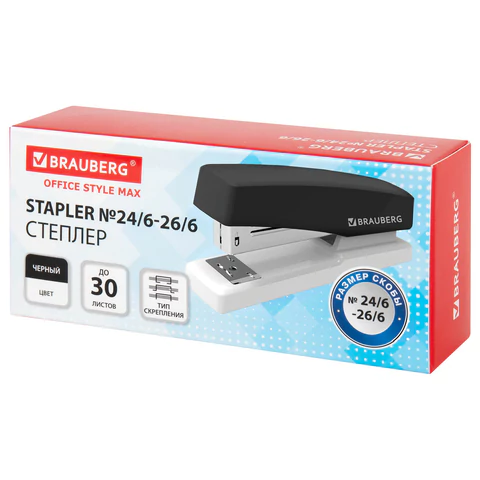 Настольный степлер BRAUBERG "STYLE MAX" № 24/6 (26/6) с пластиковым корпусом и металлическим механизмом предназначен для надежного и качественного скрепления документов в офисе и дома.