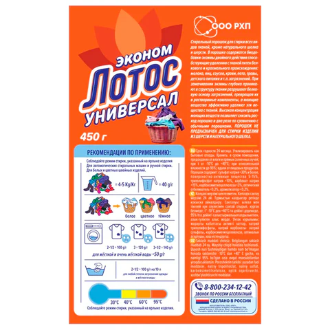 Состав: ПАВ, триполифосфат натрия, карбонат натрия, сульфат натрия, карбометилцелюлоза, оптический отбеливатель, ароматизатор.