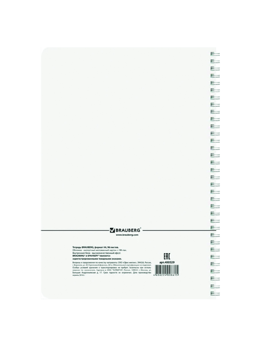 Внутренний блок содержит 96 листов офсетной бумаги плотностью 60 г/м2. Обложка изготовлена из мелованного картона. Линовка – клетка. Гребень надежно скрепляет листы между собой. Белизна – 100%. Формат А4.