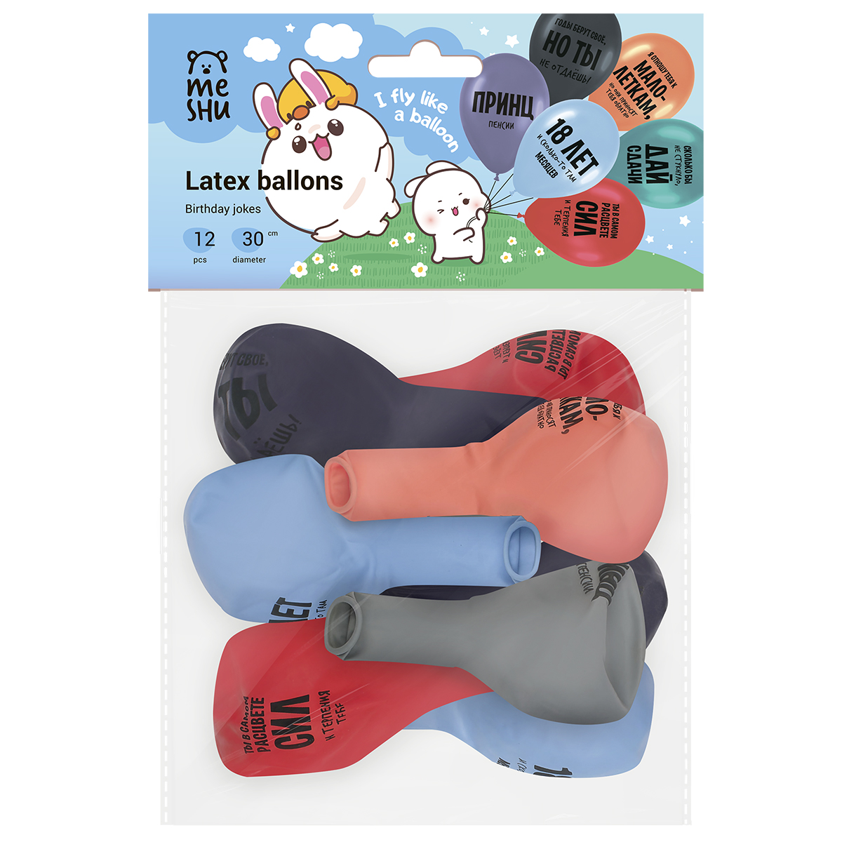 Набор упакован в яркий индивидуальный пакет с европодвесом. Дизайн упаковки с милыми персонажами создаст праздничное настроение. Шарики поставляются в ненадутом виде.