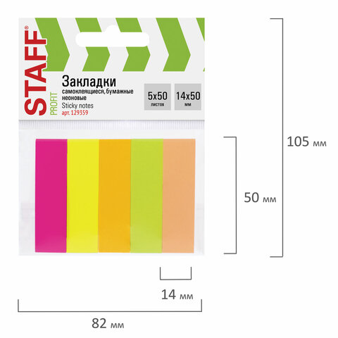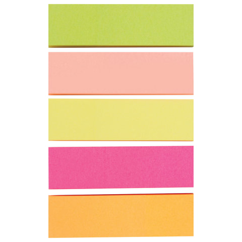 Набор бумажных закладок 5 неоновых цветов размером 50х14 мм состоит из 250 листов, по 50 закладок каждого цвета. Клейкий слой - 22 Н/м. Легко клеятся к любой поверхности и не оставляют следов. Материал закладок позволяет делать надписи ручкой и карандашом. Поставляются в полиэтиленовом пакете с европодвесом.