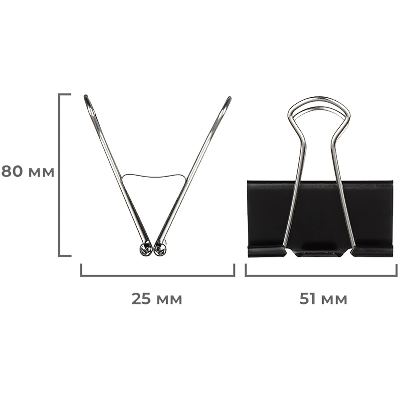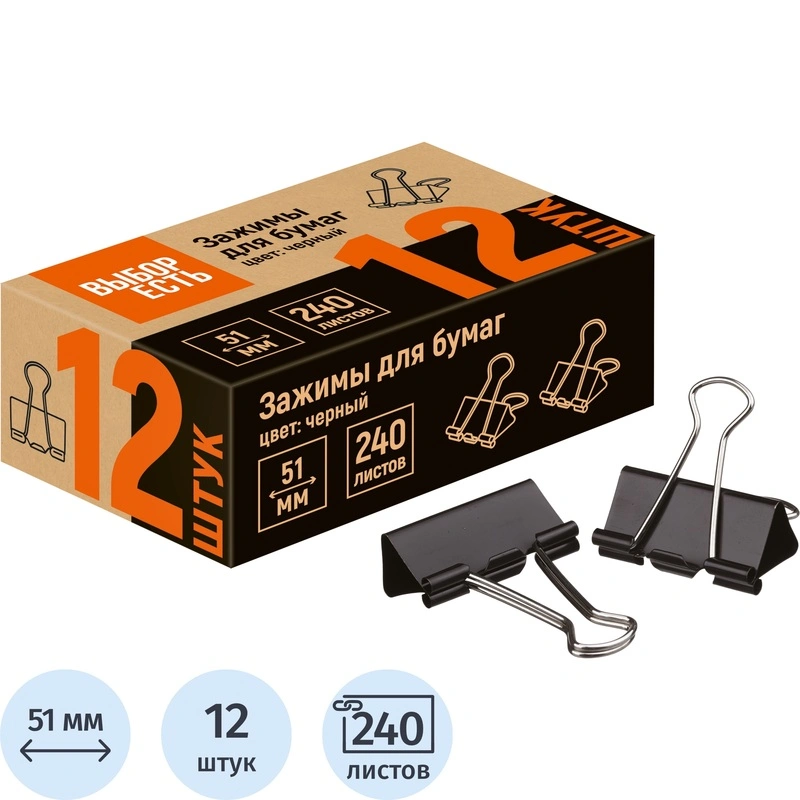 Металлические зажимы для бумаг Выбор есть используются для скрепления документов без использования степлеров. Зажимы из металла с черным покрытием. Размер зажима: ширина 51 мм, высота 80 мм, глубина закладки 25 мм. Позволяет скреплять не менее 240 листов плотностью 80 г/кв.м. Зажимы для бумаг поставляются по 12 штук в картонной упаковке. Зажимы мягко скрепляют большое количество листов, не оставляя следов после удаления и не повреждая бумагу.